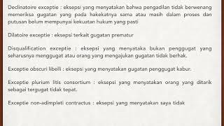 Eksepsi adalah suatu tangkisan gugatan dalam suatu perkara. Eksepsi yang tepat dan cermat akan membuat pengadilan lebih efisien dan cepat. Ada banyak ...